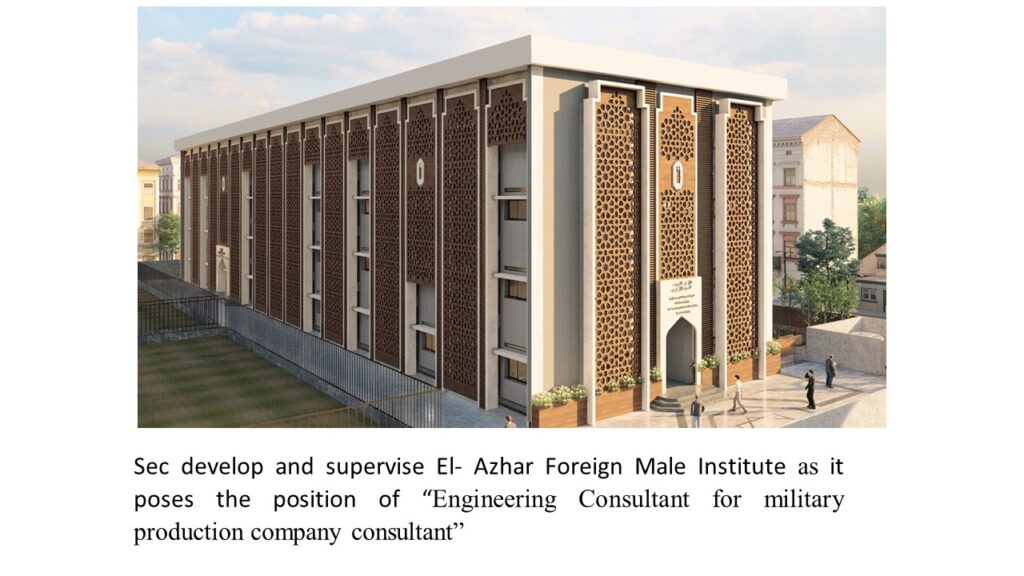 Azhar Foreign Male Institute is an institute that deals with foreigner students for that the main aim of the project is to emphasis the features of the Islamic architecture by a modern way into the educational building of El Azhar Foreign Male Institute. Sec develop and supervise El- Azhar Foreign Male Institute as it poses the position of “Engineering Consultant for military production company consultant”
