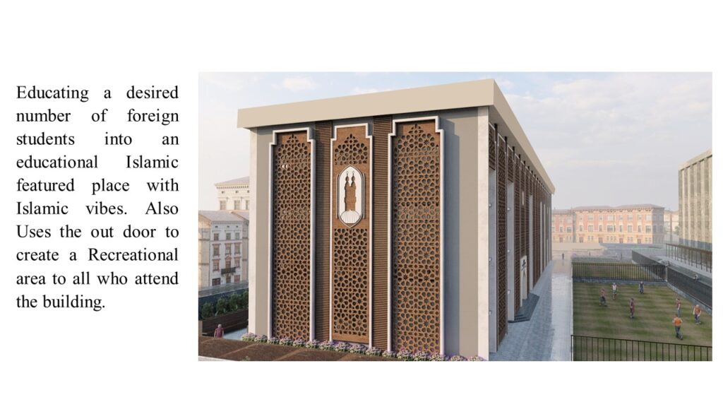 • Educating foreign students into an educational Islamic featured place with Islamic vibes. Uses the out door to create a Recreational area.