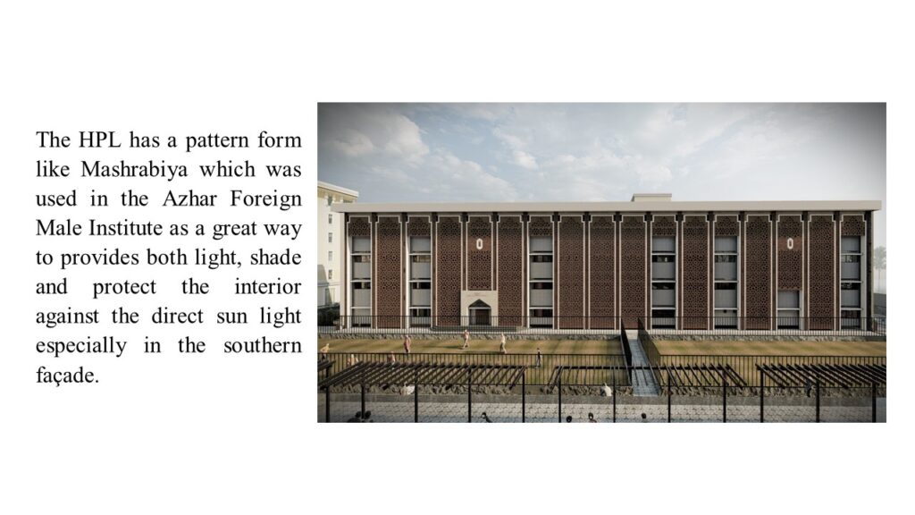 • Pattern for The HPL like Mashrabiya which was used in the Azhar Foreign Male Institute as a great way to provides both light, shade and protect the interior against the direct sun light.