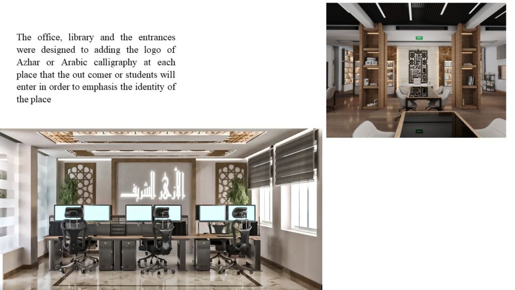 • Adding the logo of Azhar or Arabic calligraphy at each place that the out comer or students will enter in order to emphasis the identity of the place.