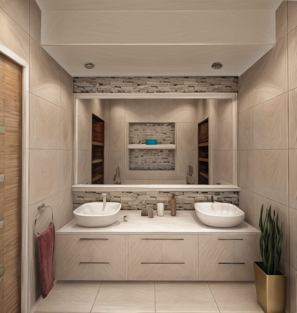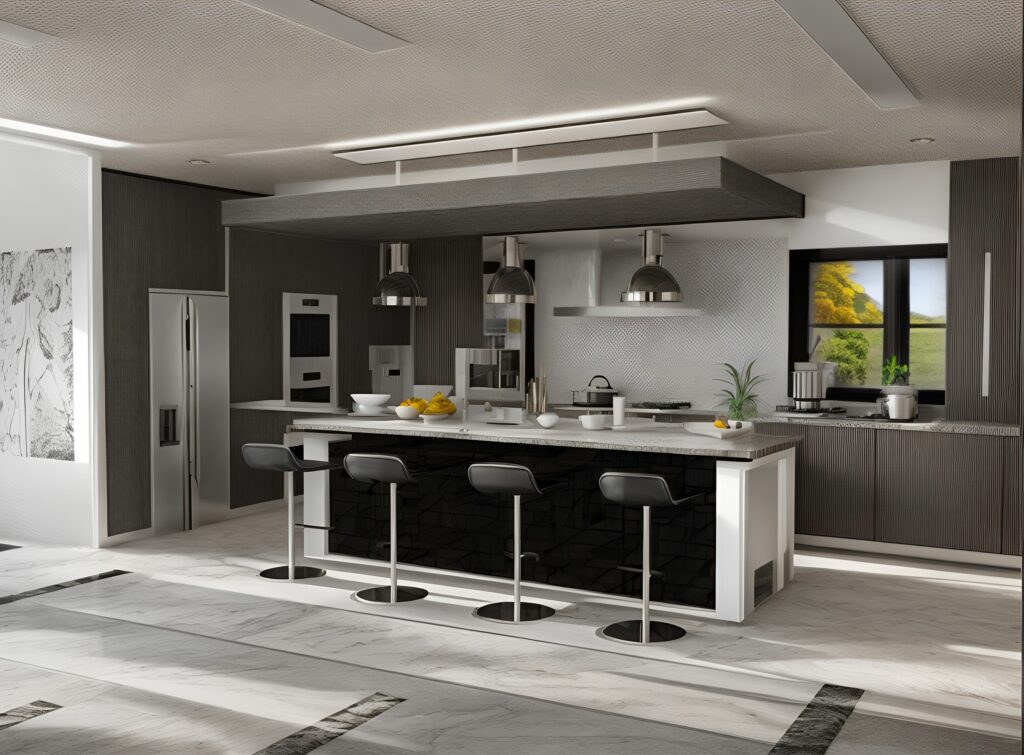 • Using modern characteristics like the clean lines (which can be noticed in the ceiling, lighting fixtures, and furniture style), the neutral materials (which can be noticed in the marble flooring which gives the space a glamours and Sleek look)